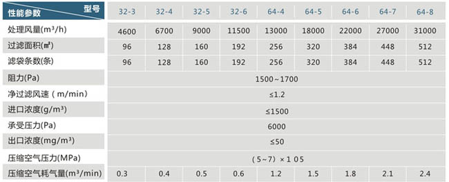 氣箱脈沖袋式除塵器PPC32、64性能參數(shù)